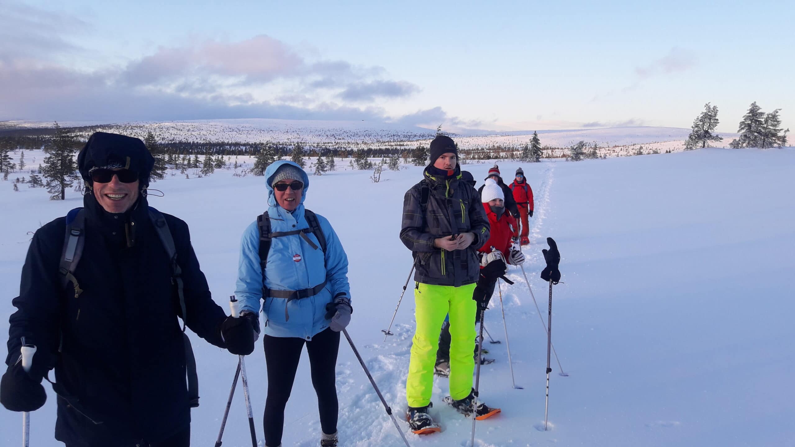 Snöskovandring i snöstäckt landskap. Snöskor finns att hyra, även för barn från 6 år.